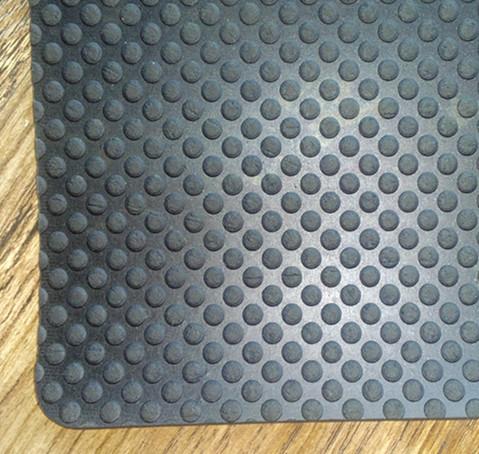圓凸點(diǎn)防滑橡膠覆膜最高寬度可達1.5米,最厚達6mm。其生產(chǎn)工藝是以凸點(diǎn)式防滑原理,橡膠表面以圓點(diǎn)向外凸出,防止人員不小心突然跌倒。